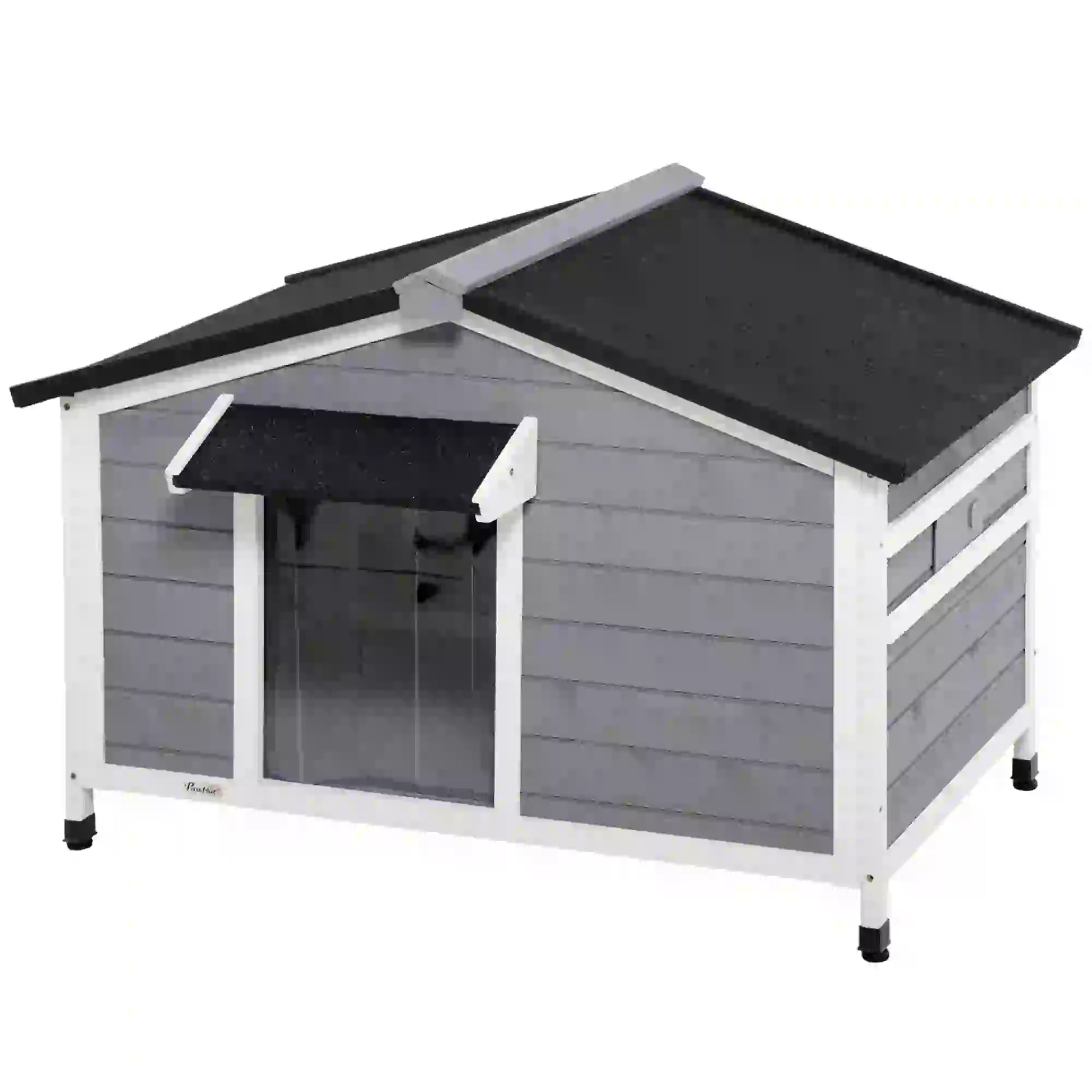 • - Niche chien cottage mêlant originalité et élégance : toit double pente, auvent, panneaux à lattes en bois gris