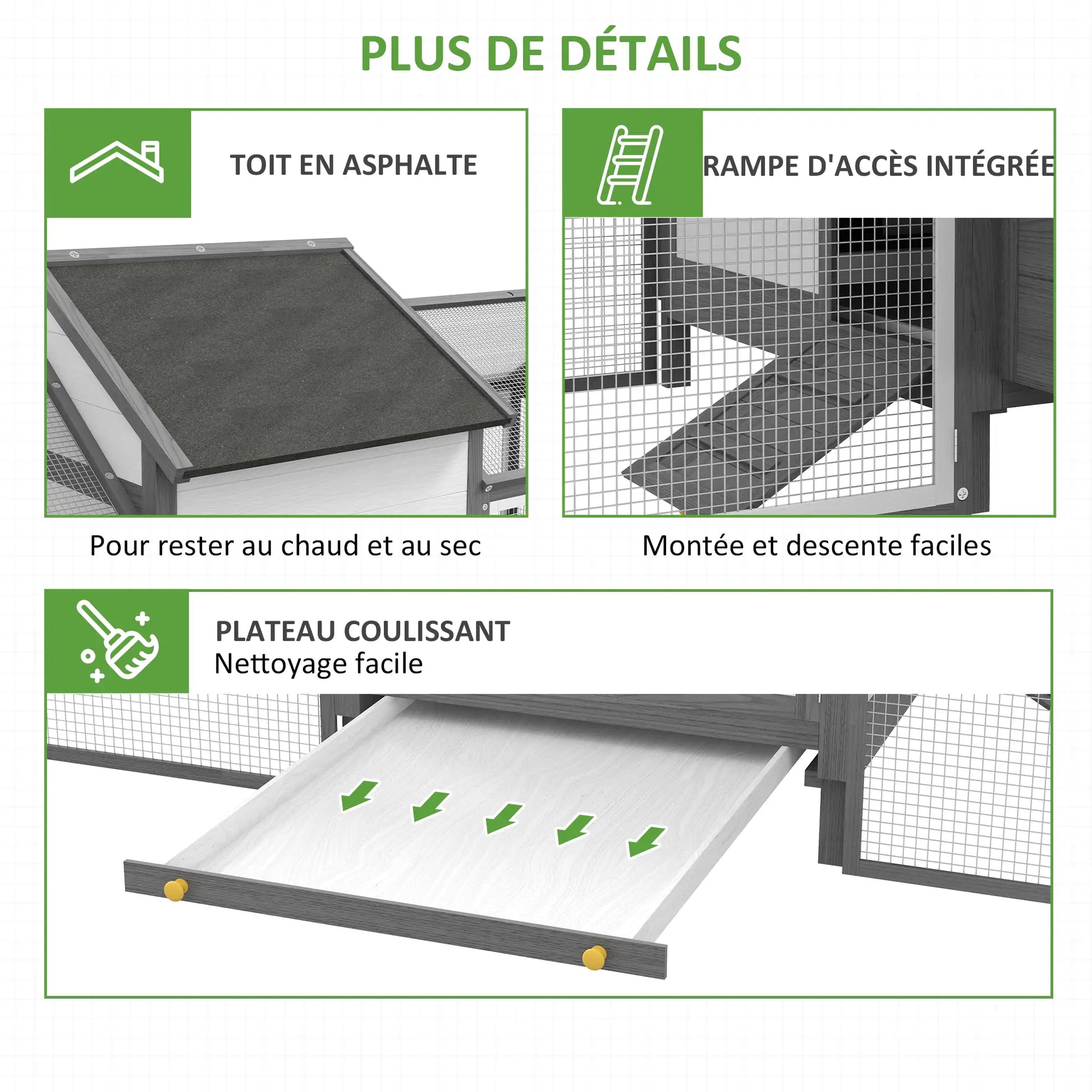 • - Le toit en asphalte protège contre les intempéries et les rayons UV, ce qui permet à vos poules de supporter les conditions climatiques difficiles